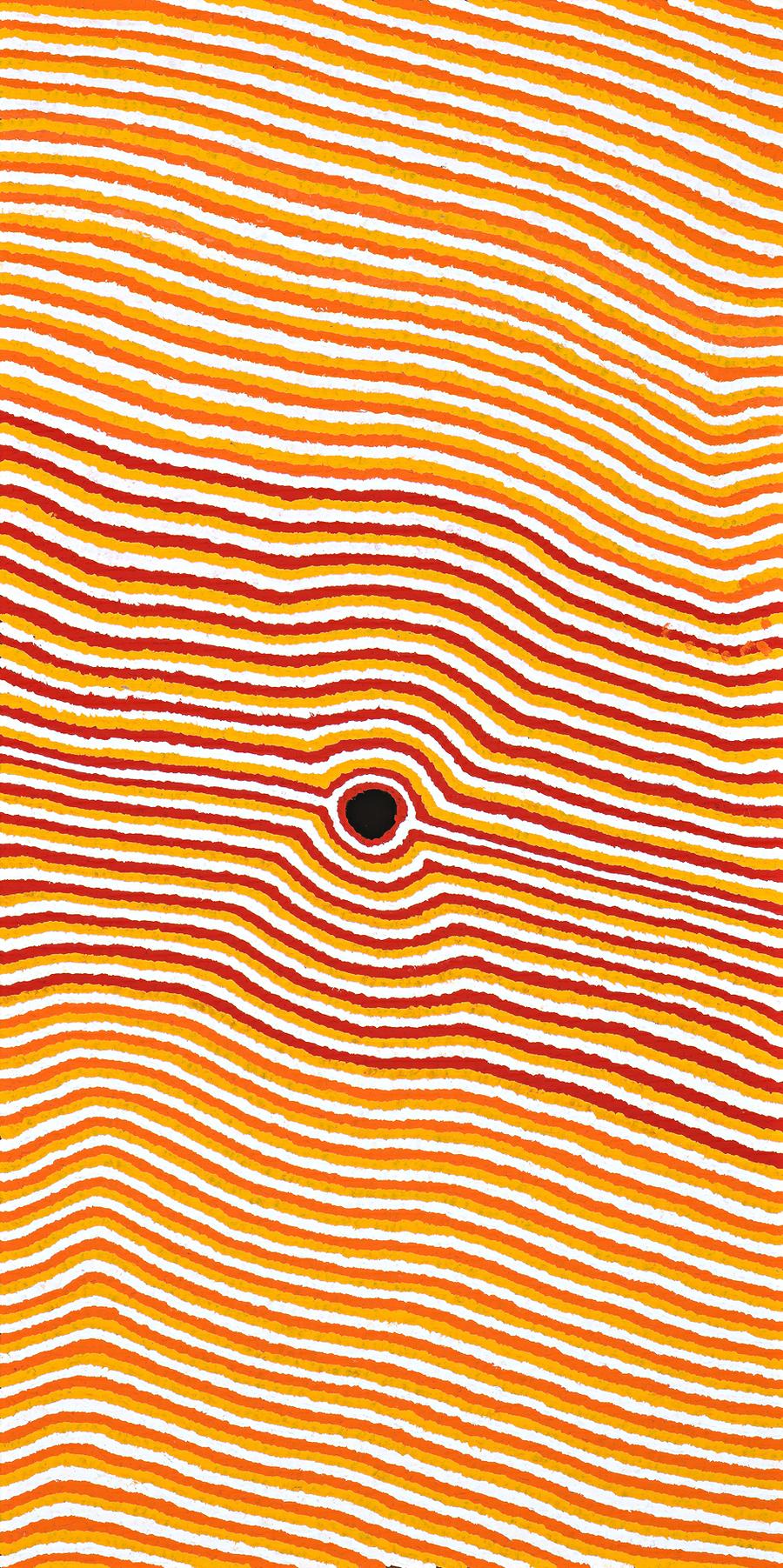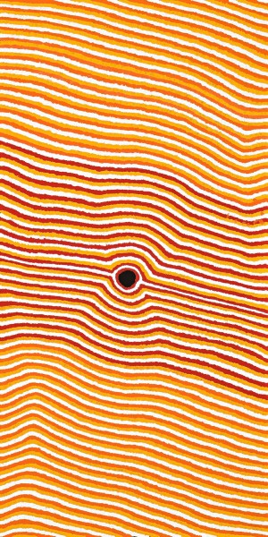 This work is accompanied by a certificate of authenticity from Warlayirti Artists which states: 'Helicopter has painted some of his traditional country, which is located far to the south west of Balgo, in the Great Sandy Desert. This country is known as Wangkardu, named for the tjurrnu, or soak water, featured in the centre of the painting. It is also the country of Helicopter's father. It was in this country that Helicopter was born, and travelled and hunted as a young man with his family. The majority of the painting represents the tali, or sand dunes, which dominate the landscape of the area. In the centre is the inta, or living water, at Wangkardu, around which people from many families would camp.'