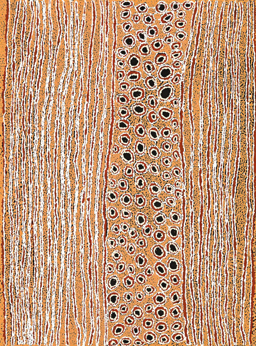 This work is accompanied by a certificate of authenticity from Papunya Tula Artists which states: 'This painting depicts designs associated with Yirangna, just to the west of the Kintore community. The lines through the painting represent the sandhills surrounding the site and the roundels are rockholes. A large group of women visited this site to gather the seed known as mungilypa or samphire from the small fleshy sub-shrub Tecticornia verrucosa. These seeds are then ground into a paste which is cooked in the coals to form a type of unleavened bread. The also gathered the berries known as ngamunypurru or conkleberry from the shrub Carissa lanceolata and the kampurarrpa or desert raisin from the small shrub Solanum centrale.'