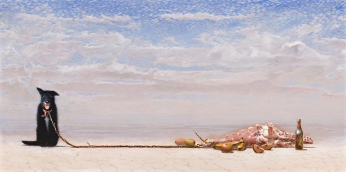 Featuring his (now departed) favourite old dog, Bunce, in various predicaments " balancing a bottle on his head, struggling with temptation or as depicted here, simply bewildered at the size of the haunch of beef at the end of his chain " the laconic studies that comprise Storrier's 'Black Dog Dilemma' series may also be interpreted on yet another, more personal level. As former director of the Art Gallery of New South Wales, Edmund Capon, suggests of a composition strikingly similar to the present, Bunce and Chain (Black Dog Dilemma II), 2007, where the dog likewise sits chained to a huge slab of meat, '... this is pretty much a self-portrait. The artist is chained to the thing that he loves doing, but is also tortured by it. The length of the chain marks the distance between intention and realisation. The black dog, as Storrier knows, is Winston Churchill's nickname for his depressive moods.'3