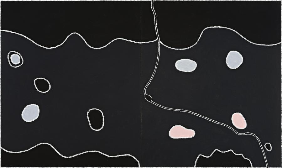 Painted across two canvases, Crocodile Hole, 2005 is a monumental depiction of his home country approximately sixty-five kilometres to the north of the Warmun Community. Now granted to family members, this site is characterised by spectacular gorge country and is a haven for wildlife, boab trees and is a permanent water site.