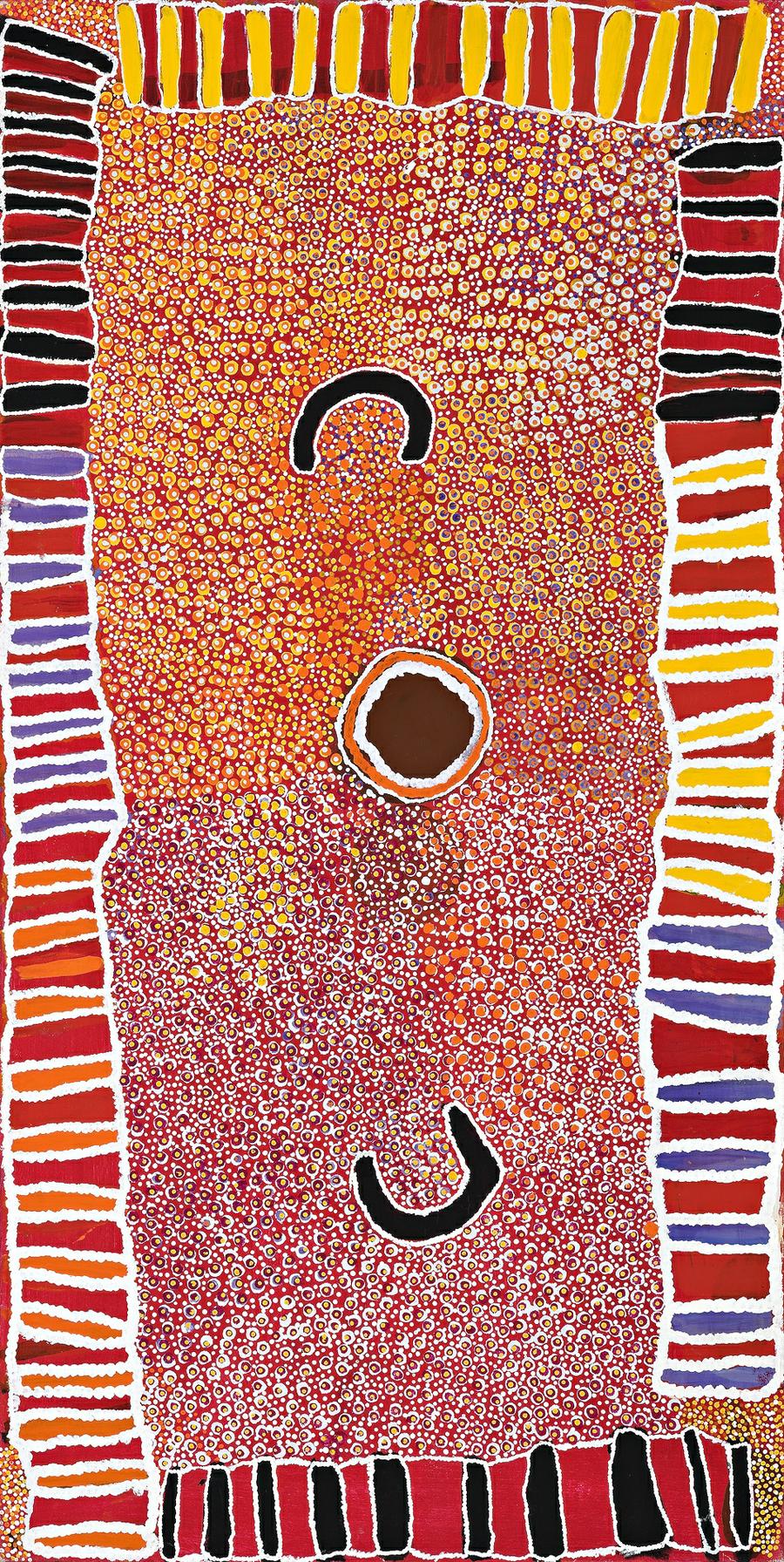This work is accompanied by a certificate of authenticity from Warlayirti Artists which states: 'This painting depicts some aspects of Susie's traditional country. This country is known as Kaningarra, named after the tjumu, or soakwater which is featured in the centre of the painting. Kaningarra is in the northern part of the Great Sandy Desert of WA. The two black U shapes are Susie's parents, camping by the tjumu. Surrounding them, and represented by the small dots are tjunda, or bush onions. The grid-like shape along the edges of the painting represented tjirripadja, or bush carrots; both of these important food sources are abundant at Kaningarra.'