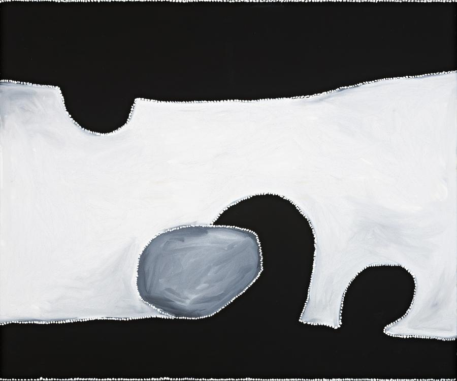 While Bedford's earlier work engaged the use of natural ochres and multiple colours, his later work employed a more restrained and pared-back palette, often using only black and white (and sometimes grey) to depict his environment. Painted in the year before his death, Mendoowoorrji evokes the cosmic skies and sparse outlines of the Kimberley landscape. Here the awkward shapes of rocks and other curious landforms are composed on a vast backdrop. There is a careful balancing act that finds some measure of harmony between these elements.