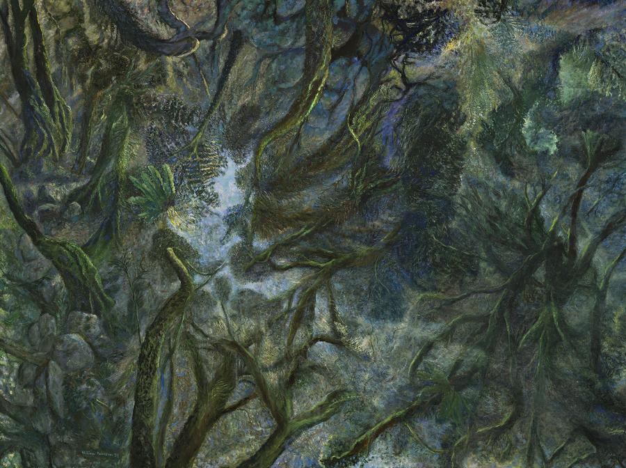 With its multiple viewpoints and sweeping panorama of darkness and light, earth and air, Rainforest with Filtering Sunlight, 1998 encapsulates the highly original landscapes for which William Robinson has become so widely acclaimed and admired. Departing from predecessors such as Streeton, Drysdale and Williams who focused their attention inland or inward to urban landscapes, Robinson is unique in his devotion to an environment hitherto neglected by artists - the ancient, labyrinthine rainforests of his immediate surroundings in the coastal hinterland of southern Queensland and northern New South Wales. Similarly, where the Australian landscape tradition had been characterised by a strong horizontality, Robinson here deliberately eschews established figure-ground relationships and conventional one-point perspective to transform landscape into a multiview experience - allowing every fold and fissure to be explored, yet still preserving a sense of panoramic continuity.