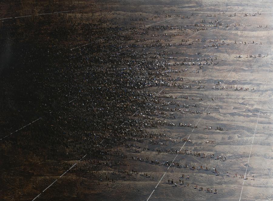 Featuring crowds of tiny figures running lemming-like towards disaster, the present composition is unmistakably related to the artist's earlier 'Omen series' which, executed between September 1972 and March 1973, is characterised by disturbing references to cages, burning spheres, speeding trains on fire, and crowds which race purposefully towards open cage doors. Among Jung's celebrated motifs, the cage notably symbolises both ensnarement and sanctuary - each of which importantly offer the possibility of transformation. While here the cage has disappeared, Daws still captures the residual panic of people fleeing from the lighter area to the darkness, with tribes or groups forming as they approach the impending doom - a powerful statement upon man's inability to handle freedom. Emphasising the terror implicit in such visions, James Gleeson elucidates: