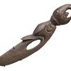In areas of the Sepik region of New Guinea, local hunters use spear throwers which are made from bamboo and often have carved hardwood attachments bound onto them. This attachment was used as a guide for the placement of the spear into the hollow shaft of the bamboo spear thrower. The guide also holds the spear in place until it is thrown. These guides represent totemic clan motifs. This expressive example has captured the essence of the cockatoo, which is often represented in Sepik carving.