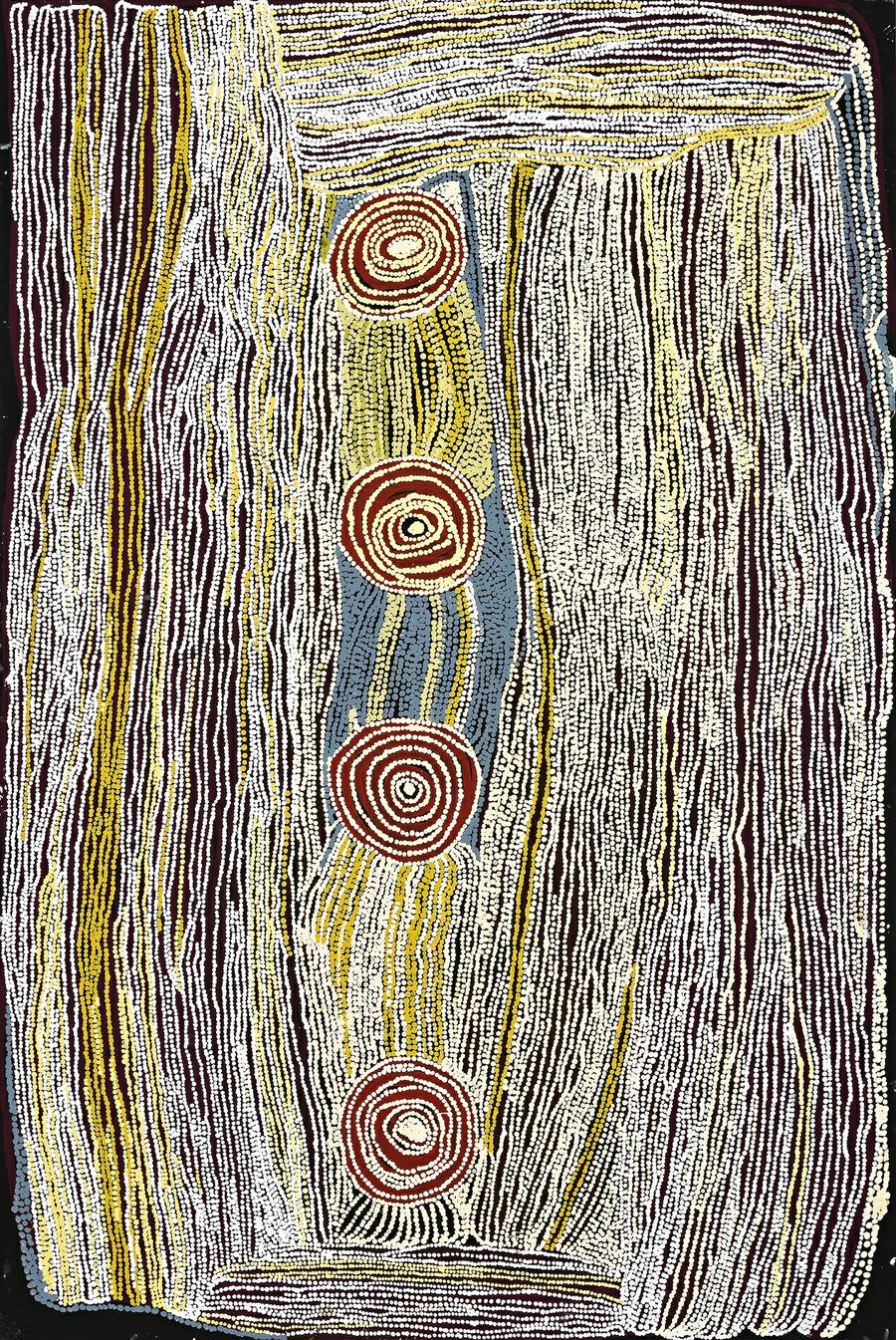 This painting is accompanied by a certificate of authenticity from Kayili Artists which states in part: 'Many women are camped at a water site called Kurratjiti, which is west of Patjarr. At this place they collect the seeds of a species of Acacia, which the women beat from the branches, then winnow to separate the seed from the husk. Once the seed is cleaned the women grind it up mixing it with water to make a paste, called lungkunpa which is eaten raw. The women travel to Yurnimpa where there are two rockholes, the women then travel east to Yunpalarra where pintalpa (bush tomato) grows.'
