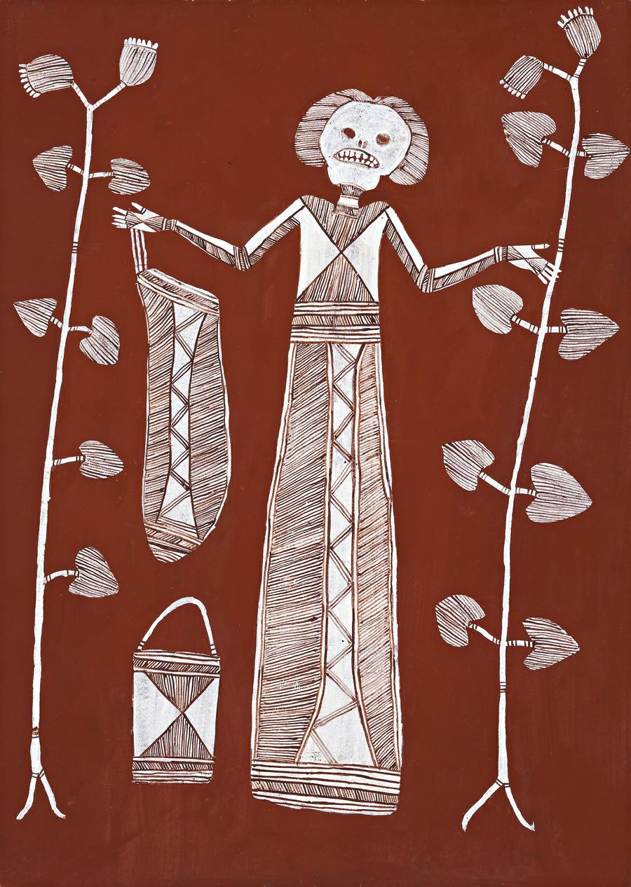 This painting is accompanied by a certificate of authenticity from Marrawuddi Gallery which states: 'Wakkewakken are a type of legless Sugarbag Spirit associated with Ankung Djang, a major Sugarbag complex in Mok Clan estate in the Liverpool River. Here they live deep in the cold water at places like Djabidi Bakoluy, Bibiddoy and at Ngaldaddubbe. During the day the Spirits leave their homes and move around the country gathering an edible bush fruit called Anwak (Leea Ruba). She lives at these places with Ngalyod the Rainbow Serpent and other Sugarbag Spirits.'