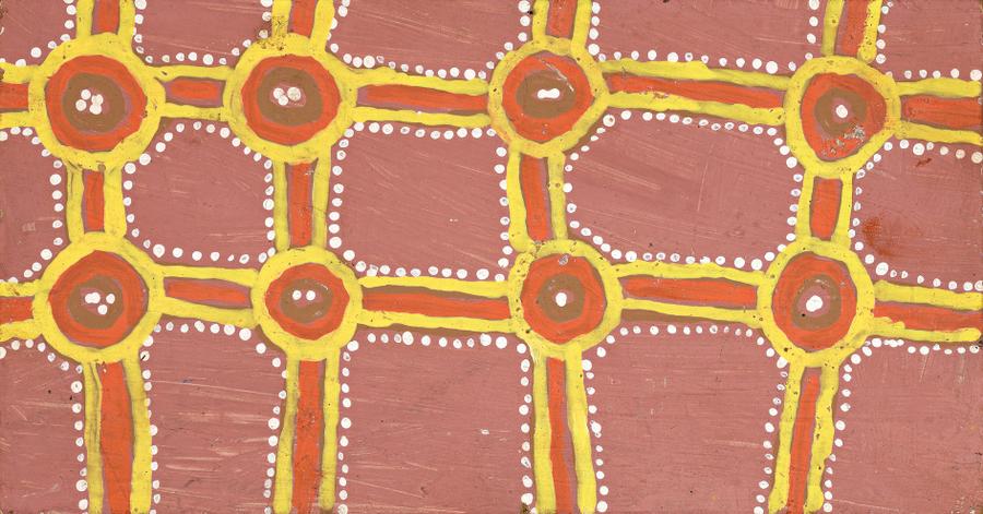 This painting is accompanied by documentation with an annotated diagram and interpretation of the imagery prepared by Geoffrey Bardon which states: 'The grid like uniformity in this pattern represents a map journey where the concentric circles depict significant places and the linking lines imply journey or travelling in between across the landscape. The pattern is a stylised map possibly of an immense area and the simple colour methods and dotting decorative pattern date this work as an archetypal example of sand mosaic motifs, of fundamental meanings, only, to be included.'