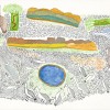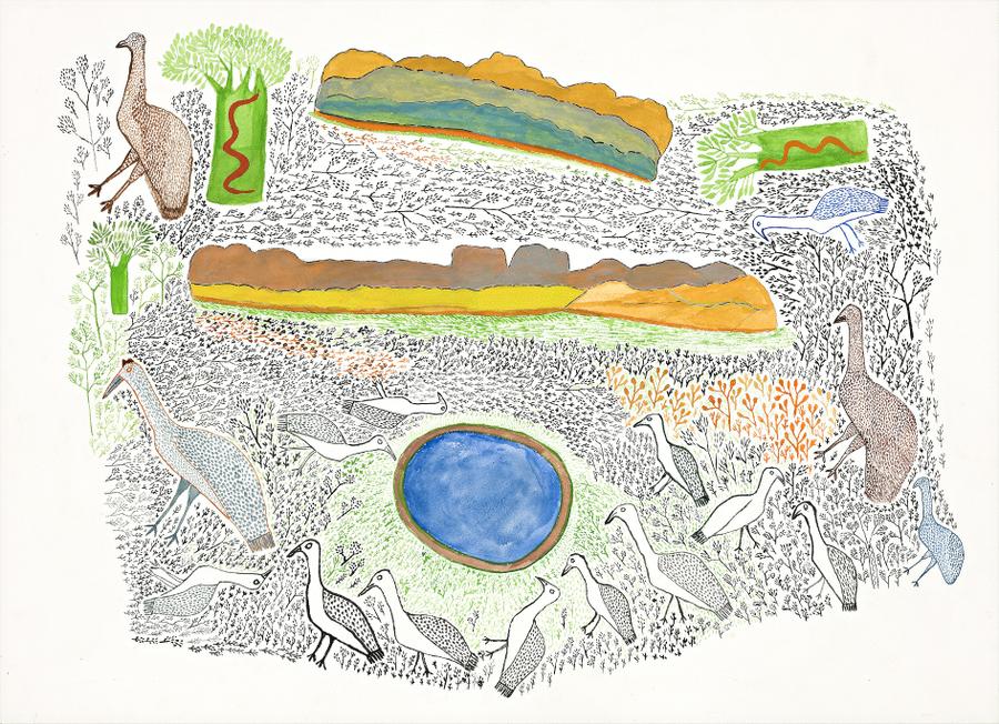 This watercolour by Wattie Karrawara was part of a larger group of paintings, 38 in total, commissioned by American anthropologist John McCaffrey in 1965. The watercolours depicted many of the characters and scenes which typically form part of the Wandjina cosmological repertoire. In this work an open landscape is filled with vegetation that includes kurrajong, acacia and boab trees. Emus and water birds including Herons and Jabiru walk through the acacia scrub at the base of a rocky massif and encircle a dominant water hole. The serpents descending the boab trees were a common feature of the watercolours. They may indicate the affinity between larger boab trees and spiritual beings