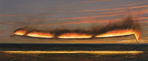 With its sublime beauty and disorienting juxtaposition of real and surreal, Evening Blaze encapsulates well the highly individual evocations of nature that have brought Tim Storrier such widespread acclaim. Fascinated by the concept of the seemingly endless horizon - and particularly, that exciting point where horizon meets the sky - during the eighties, Storrier began experimenting with three dimensional constructions of wire, rope and steel which he would install in remote locations and subsequently ignite, capturing the entire dramatic event on cibachrome film. Deriving their impetus primarily from these 'performances', the 'point to point' paintings which ensued thus explore an iconic image whose atmospheric resonance differs widely depending upon the time of day or night.