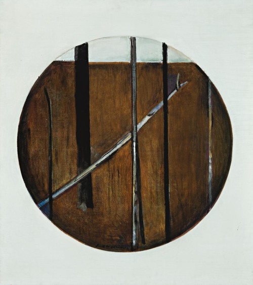 Turning from the once perceived monotony of fields and forests of eucalypts, Williams painted melodies of nuanced colour, textured, encrusted paint, of detail touching the universal. As often observed, Williams discovered new variety and beauty in the sameness of the Antipodes. Superbly minimal as are his works of this time, the interplay between the classic flatness of the picture plane and the illusion of depth is Williams at his best. While trunks recede in ordered recession, the dominance of those on the picture surface keep the rightful order in its place. Then one falls sideways into the picture space, creating an illusion of depth. The tug-of-war between surface and depth continues in vertical immobility versus angular movement. It fascinated Williams and he explored it in a number of earlier works known as 'The Forest Series' of 1961-62, and especially an oil of 1962 of the same title, not as close in focus, with the fallen tree leaning the other way.1 The later Fallen Tree of 1968 (private collection) is almost identical to our painting, also circular of composition, and included in the recent Fred Williams retrospective at the National Gallery of Australia. The etching Fallen Tree, 1967 is close in imagery, impressions being in the best collections. Remarking on the monotony of the Australian landscape and lack of a focal point, Williams said, '... if there's going to be no focal point in a landscape [then] it had to [be built] into the paint'. Here, the circle itself creates that focal point.