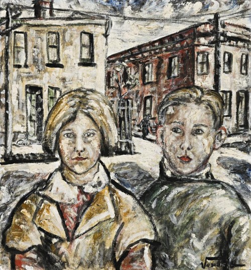 Here the two children in the lower half, probably a brother and a sister, look away from the faded grandeur of their background - the inner suburb of Fitzroy - towards and past the artist. They capture the eternal in the everyday. They are what Danila Vassilieff would have described as the 'real' people, those who would not normally be painted.