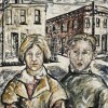 An almost classic Fitzroy street scene, this painting reflects the humanism Vassilieff brought to Australian art. The two adolescents anchor the composition, rapidly brushed, in mainly earth colours. Their black rounded outlines contrast with the structural lines of their setting, for example the telegraph pole that springs up from his head and the honey-comb of black guttering that links her bundle of hair to the corral around the wintry street tree.