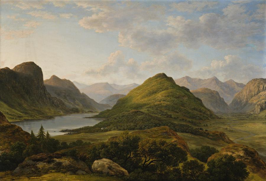 The English Lakes District has long appealed to the painter and poet. In 1783 Thomas Gainsborough painted there; also J.M.W. Turner and Constable, who toured the district in 1806. Glover's passion resulted in many visits between 1793 and 1824, eventually settling at Blawick Farm on Ullswater near the village of Patterdale.1 Of the peak of Helvellyn, Britain's third highest mountain, William Wordsworth was inspired to write - 'From the watch-towers of Helvellyn: Awed, delighted, and amazed!'2 In Glover's painting the mighty Helvellyn is seen to the east, viewed from the south, Raven Crag rises to the west of Leathe's Water, and mounts Skiddaw and Saddleback are in the further distant east. Amidst such natural splendour, Glover engaged a clarity and high finish to enable the achievements of human endeavour also to be seen, not insignificant within such wonders. A boatman plies still waters, sheep graze on cleared land, and a home finds its place among the woods - believed to be Dalehead Hall, the ancestral home of the Leath family since Elizabethan times of the seventeenth century. Glover envelops all in a mood of calm and classical order, the nobility of man nestled within that of nature in the sparkling light and wondrous beauty of the landscape of Cumbria.