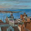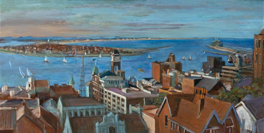 Given that cloistered subjects and still lifes dominate her art, it is a pleasure to come across a landscape, similarly endowed with the life that her brush brought to all things. 'I used to love painting landscapes and I used to do a lot of it', she once confided. 'But I don't drive; I'm not mechanical ... And the time! so sometimes I'll introduce a landscape into a painting through a window.4 In 1969 Olley bought some houses in Newcastle, spending time restoring them and painting pictures of the busy harbour scene. The next few years resulted in several related views, especially Rainy Day Newcastle, 1971 and State Dockyards, Newcastle, 1974.5 Rainy Day Newcastle and Newcastle Harbour, c1975, taken from a spot on 'The Hill', are close in view, foreground buildings and roofs much the same, a slight move in position resulting in either a long view up the Hunter River, or, in our work, across to the suburb of Stockton. To the right the river flows passed the Nobbys Head into the Pacific Ocean. The play of light on white sails and buildings gives added movement to the scene, sparkling as the sun draws west towards evening and deepening shadows. (Paintings of the view date back to early colonial settlement and the work of Joseph Lycett.) While the panoramic splendour of our painting contrasts with the enclosed interiors and paintings of flowers and fruit, all share busy brushwork and colour inspired by Olley's approach - 'Keep your sense of curiosity and wonder.'6 Art for Olley was a celebration of life.