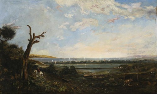 This 1860s view of Port Phillip Bay from Royal Park depicts an exciting moment in Melbourne's early development. The clear blue lagoon of Batman's Swamp and the surrounding meadows and tea tree thickets are yet to be despoiled, dozens of sailing ships anchored in the bay, still bringing diggers to the goldfields, with a building boom gradually filling Sandridge (Port Melbourne) and Williamstown. The main part of the city is out of view over the hills on the left, leaving a rural idyll with only scattered traces of the incursion of civilisation.