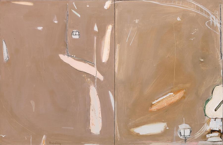 Brett Whiteley returned to Sydney in November 1969 with his wife Wendy and their little girl Arkie after almost ten years in London, Europe, America and Asia. They settled in a white three story house in Walker Street, Lavender Bay overlooking the harbour through the fig trees and frangipani.1 The views from the windows of the sitting room were picturesque and uninterrupted reaching out to the arch of the Harbour Bridge and its rusticated pylons. In 1974 the Whiteleys purchased the Lavender Bay house and the artist began one of his most adored and diverse series of works - the Lavender Bay Series. It was a subject he would return to often in numerous media, evoking the many dramatic weather changes experienced on the harbour, from azure blue days, starry nights and grey days thick with rain. Sydney Winterof 1980 is one of the rain meditations, the palette of which is born of those smoky abstract works painted in London during the early 1960s.2