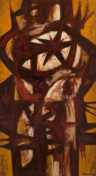 In 1963 John Coburn held a solo exhibition at the Hungry Horse Gallery in Sydney, where The Tower was one of thirty paintings and drawings exhibited. Representing a significant phase of Coburn's career, The Tower was one of the first works that he executed in synthetic polymer paint after years of working almost exclusively with oils. The flexible nature of synthetic polymer paint allowed Coburn a certain freedom and spontaneity which translates onto the surface through the liberally applied layers of paint. This is particularly noticeable when compared to the highly constructed works that Coburn would go on to produce. The picture on offer was considered by the artist to 'satisfactorily' represent his period of the early 1960s, where he had recently adopted a freer expressionistic style.1 In an interview with James Gleeson in 1979, Coburn discusses The Tower and its relevance to his oeuvre:
