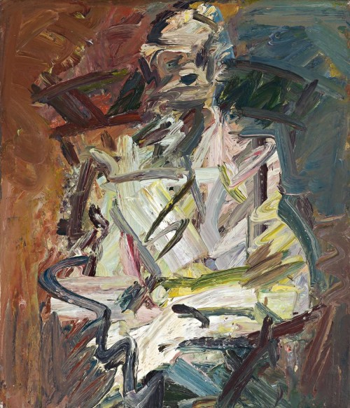 Landau's insights into the evolution of this portrait are even more revealing about Auerbach's general working methods. Over many years, the paint surface is scraped off, rebuilt, reshaped and 'sculpted', as if his raw material is modelling clay rather than pigment. After each sitting, he ruthlessly scrapes the paint off so that just a shadow of an image remains for the next session: 'It is a bit disturbing ... particularly on those occasions when you remember from the last time that the painting was quite good. You think this was a really beautiful picture and yet it wasn't good enough for him. Next time you arrive it will be a scraped-down ghost.'5