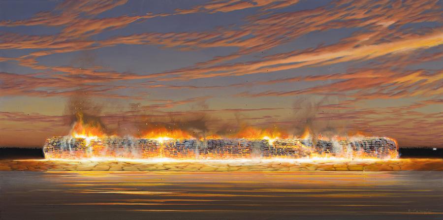 Storrier's waterline paintings continue this tradition of mesmerising depictions of fire, but they have evolved into more complex narratives than the artist's earlier work. In our painting we encounter the artist's distinctive flat horizon line and immense, uncompromising landscape. But the wire here has been replaced with a burning log on a sandy shoreline, invoking a host of dark associations relating to natural disasters and displacement, to watching one's house burn down or a ship go up in flames. The surrounding stretch of ashen water acts as a kind of isolating barrier. We cannot reach this traumatic scene, we cannot help, we can only look on from the distance. The sky is scattered with pink sweeps of cloud: it is dusk, and we are reminded that the day is fading but the fire will continue to burn.