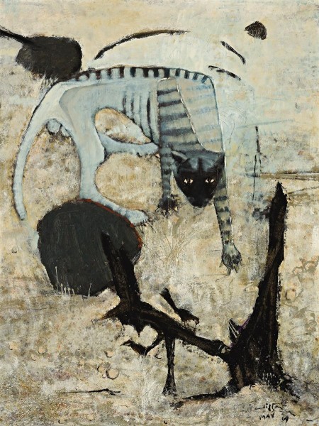 In A Feral Cat, 1969, the feral cat is the victim. Hungry and thin following a season of drought and fire, the cat's staple diet of small marsupials and lizards has all but gone. Now this big tom is forced to work harder for survival as he stalks his prey, fully aware that his next twitch will trigger the bird's flight to safety. The cat is frozen, so near and yet so far from a meal and survival. Pugh chooses to depict the cat's form as an echo of the surrounding landscape, and in this way he stresses the cat's vulnerability - for it too may soon be absorbed into the landscape.