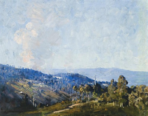 Fire Begins, 1930-31 was among a number of oil paintings shown by Streeton in his 1932 exhibition held at the Fine Arts Society Gallery, Melbourne during March into April.The major works included The Sylvan Dam and Cliff and Ocean Blue, among such others as Studio and Lodge,'Longacres', and numerous paintings of flowers. The art critic for the Melbourne Argus commented - 'The mastery of a gifted painter of long experience is shown in all ... The recent work [he added] has remarkable freshness, combined with its strength and distinction.'1 Streeton's ability to capture the panoramic majesty of the landscape is a highlight of many of these paintings, the extraordinary feeling of distance in Fire Begins, 1930-31, being shared with The Sylvan Dam, and Cliff and Ocean Blue. The latter painting, which belongs to a group Streeton painted during a visit to Victoria's Port Campbell at the time, expresses another feature they share - the awe inspiring might and miracle of nature. In Fire Begins, 1930-31, Streeton celebrates the splendour of the heavens in harmony with the nobility of the earth.