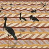 In Gumingi, Magpie Geese, 1987, meticulously painted Magpie Geese stand in an Arnhem Land wetland, most likely the Arafura Swamp. The surface of the swamp is carpeted with rarrk designs spreading far into the distance and beyond, alluding to ever present aboriginal spirituality that pervades every natural place. It is this spiritual narrative that ebbs and flows through Onus's work, first appearing in works such as Guminji, 1987 and Jimmy's Billabong, 1988 in the collection of the National Gallery of Australia, Canberra and flowing on through his later lilypond and fish paintings and the large reflective Barmah Forest canvases.