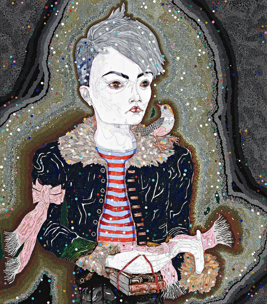 The delicate linear qualities and exuberant patterning at the heart of Del Kathryn Barton's practice combine in but passion has made his face like pale ivory, 2011-12. The artist's drawn lines articulate the male subject's facial planes like a tender topographical map. This intimate rendering of every minor shadow is charged with the romantic and passionate connotations of lingering observation. An intimacy that is accentuated by the concentrated gaze of the subject's own eyes and the nearly pointillist force field that encircles him.