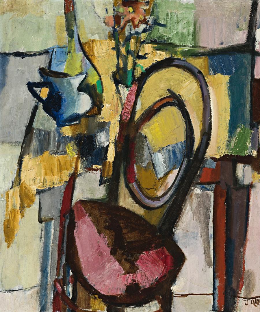 When the young Turk becomes Australia's greatest living artist, one looks with different eyes at the youthful creations, seeing and admiring those first stirrings that made his art so great. So it is with John Olsen and his painting. He was just out of art school, having studied under John Passmore during 1948 to 1953, Still Life, 1954 being so redolent with the beneficial Passmore influence. But like all gifted people, it was the beginning from which he developed his own striking individuality, a vitality and vision today so readily identified with Australia and being Australian. The chair, table, jug and flowers are common props of still life painting. The high viewpoint looking down at the group gives opportunity to dispense with pictorial illusions of depth and ply the paint across the picture plane in patterns of colour and textured surfaces. The master of landscapes and still lifes, Cézanne, and Cubism comes to mind. As Deborah Hart in her monograph on Olsen has observed, 'Passmore's importance for Olsen as a teacher was felt not only in direct observations about drawing and painting, but also through his interest in literature.'1 Olsen became a hungry reader, his love of poetry still evident today in his writings and speaking. For Olsen, even the prosaic genre of still life, as in our painting, is given a poetic touch. The lively colours touch upon the lyrical; forms rhyme and repeat with a metered beat. The presence of a table, bottle and jug hint at the bon vivant to come, paintings titled Portuguese Kitchen, 1966 (two versions), and Duck à la Orange, 1981, with eggs as constant fertility symbols within the landscape talk a lot of one fond of food. One also recalls a bigger canvas of the time, Still Life with Boy, 1954 in the collection of the Newcastle Art Gallery, Newcastle being Olsen's birthplace. The table is loaded with preparations for a meal, a fish central to the scene.