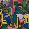 Weaver Hawkins quickly became a leading figure in the more progressive art organisations in Sydney, serving as President of the Contemporary Art Society from the mid 1950s until 1963. He is perhaps best known for his large allegorical murals which blended Great War imagery with cold war symbolism and warnings of nuclear holocaust. These works however were just part of an impressive output which included powerful bush landscapes, studies of surrounding domestic life and a number of very fine depictions of athletes and sportsmen in action. His Domestic Interior is an elegantly composed work, with two women working quietly at home in a room strikingly furnished with what might be seen as Van Gogh's yellow chair and table. Emphatically hard edged and two-dimensional, the painting uses colour and flat shapes to build a resonating image of tightly interconnected forms. Like his near neighbour in Sydney, Frank Hinder, Hawkins continued to champion the principles of good graphic design and abstract values right until his retirement from active painting in 1972. He was the subject of a major project exhibition at the Art Gallery of New South Wales in 1976, which was followed by a touring memorial retrospective exhibition after his death a year later.