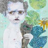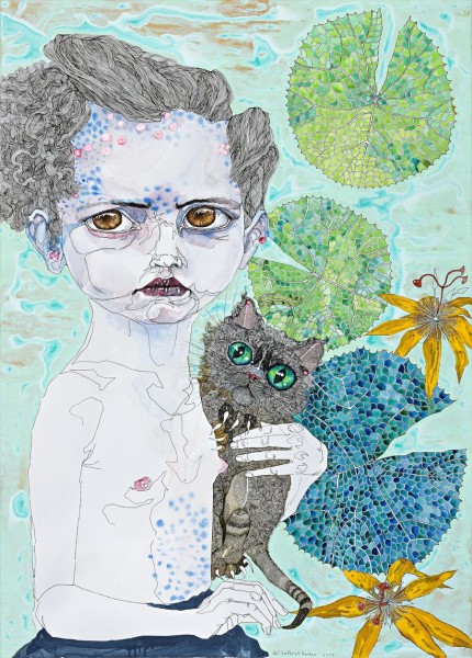 Painstaking in its embellishment, girl #9, 2004 not only indulges Barton's fascination with the world of children, but continues her enduring preoccupation with the female face as a repository of thoughts, emotions and fantasies. Occupying an enchanted realm adorned with flourishes of foliage and wildly chaotic patterns, the work betrays a compulsive beauty in its infinitely rendered elaboration. Yet if alluding to the imaginary, naive world of children, at the same time the direct, steady gaze of the sitter implies a certain knowingness or wisdom - what does she reveal with her overblown face and simultaneously conceal with her innocent stare? Like the protagonists punctuating countless fairy tales and mythological stories in Western art and literature, indeed Barton's ethereal sprites are already adult, expressive and sexually empowered. That the present sitter embodies a wealth of human desires, repressions and fears is eloquently reiterated here by the feline companion which she guards. Continuing the artist's abiding concern with the effect of nature upon humankind's physiological and metaphysical existence, the animal poignantly evokes the duality of the human psyche and the seemingly impenetrable mysteries which it holds - what seems cute and benign may also be carnal and predatory.