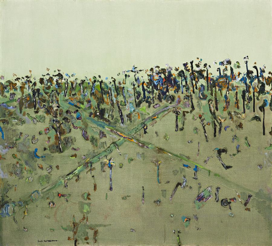 Featured in the important Fred Williams retrospective exhibition curated by James Mollison for the National Gallery of Australia in 1987, One Tree Hill 1968 is a singular, major work in an oeuvre distinguished by individuality. It is the first Fred Williams painted in oils, out of doors, in his mature style. Moreover, the usual browns and ochres give way to greens celebrating the fecundity and regenerative powers of nature. On a winter's day in June 1968 Williams set out with his fellow artist Hal Hattam to paint in the Ferntree Gully National Park in the Dandenong Ranges. Later that day he wrote in his dairy, 'Down the track at the pond at F.T.G.N.P. find a very lovely spot "I had previously made several gouaches here and we work all day" in spite of drizzle. These are the first outdoor oils I have painted in many years! ... This has probably meant my closest look at a piece of country since the early days at Lilydale.'1 During the previous summer the fires that ravaged the Dandenongs nearly destroyed Williams's home at Upwey. The traumatic yet inspiring experience led him to paint the very moving bushfire series including such works as Burnt Landscape 1968 in the Gordon Darling collection. Back in his studio following the Ferntree Gully excursion, Williams painted the related oil One Tree Hill 1968-69, the dark presence of ashes placing this and our painting among the series which embraced the destructive and regenerative powers of nature. In One Tree Hill 1968, a painterly celebration of the latter, the emphasis is on abundance of growth. This he achieves through a range of rich colours and textures within the landscape, enveloped in a delicate mist of greens. By working directly from the motif, Williams was able to capture the transient winter drizzle with impressionistic verve, subtly expressing the rain falling from the sky across the land through the vertical movements of his brush.