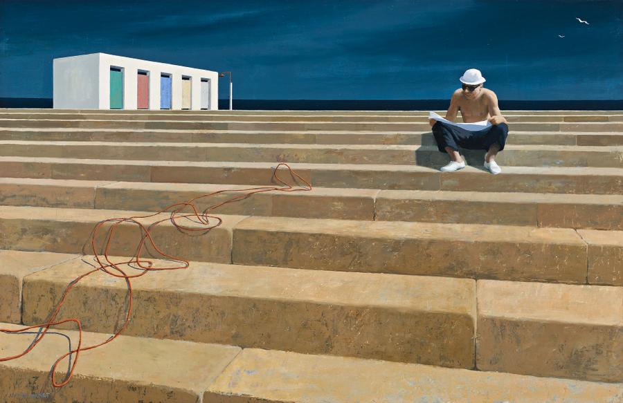 Jeffrey Smart's Ostia might be seen as an allegory for his own life over the previous decade. As 'Phidias', the art mentor on ABC radio and television for thousands of Australian children, he strode the steps of an imaginary Parthenon, bringing light and wisdom to eager young middle-class minds. A decade later the great steps are made real, leading upward to a concrete temple, a row of bathing boxes with a rank of coloured doors beneath a lowering sky. Phidias is now a relaxed Italian worker, white towelling hatted and bare-chested, at home on the podium as he reads the form guide or the latest political scandal in Rome. As always with Smart, the composition is impeccable, studied and measured with Euclidean precision, the starkness and geometry of the image softened only by a random length of cable snaking up the stairs. Jeffrey Smart was revered as one of our greatest painters, yet spent more than half his life out of the country. His works sold in Australia in impressive quantities at significant prices, yet his subjects were uncompromisingly international. While Arthur Boyd, Fred Williams, John Olsen and John Perceval sought to define an essential Australian-ness in their work, Smart worked just as hard to rid himself of any national or regional references. Of his contemporaries, Smart was probably closest to John Brack, with whom he shared a steadfast belief in the absolute fundamentals of painting - composition, design, line, colour and form.