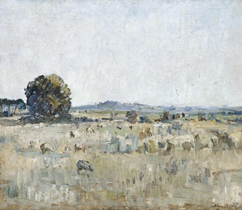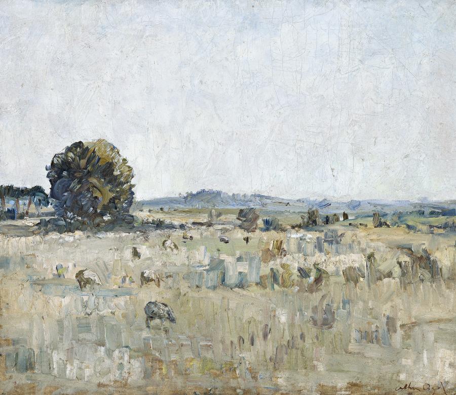 Arthur Boyd's early Rosebud paintings are significant, being amongst the artist's first fully-resolved and exhibited works. They offer both atmosphere and painterly dexterity, as Boyd immersed himself in the landscape of the Mornington Peninsula while living for three years with his grandfather, Arthur Merric Boyd senior, in his Rosebud cottage. Sheep Grazing, Rosebud, 1938 captures the peninsula's hinterland and closely relates to the artist's Sheep in field, 1937, in the collection of the National Gallery of Australia, Canberra, and included in the recent NGA exhibition Arthur Boyd: Agony and Ecstasy.1