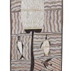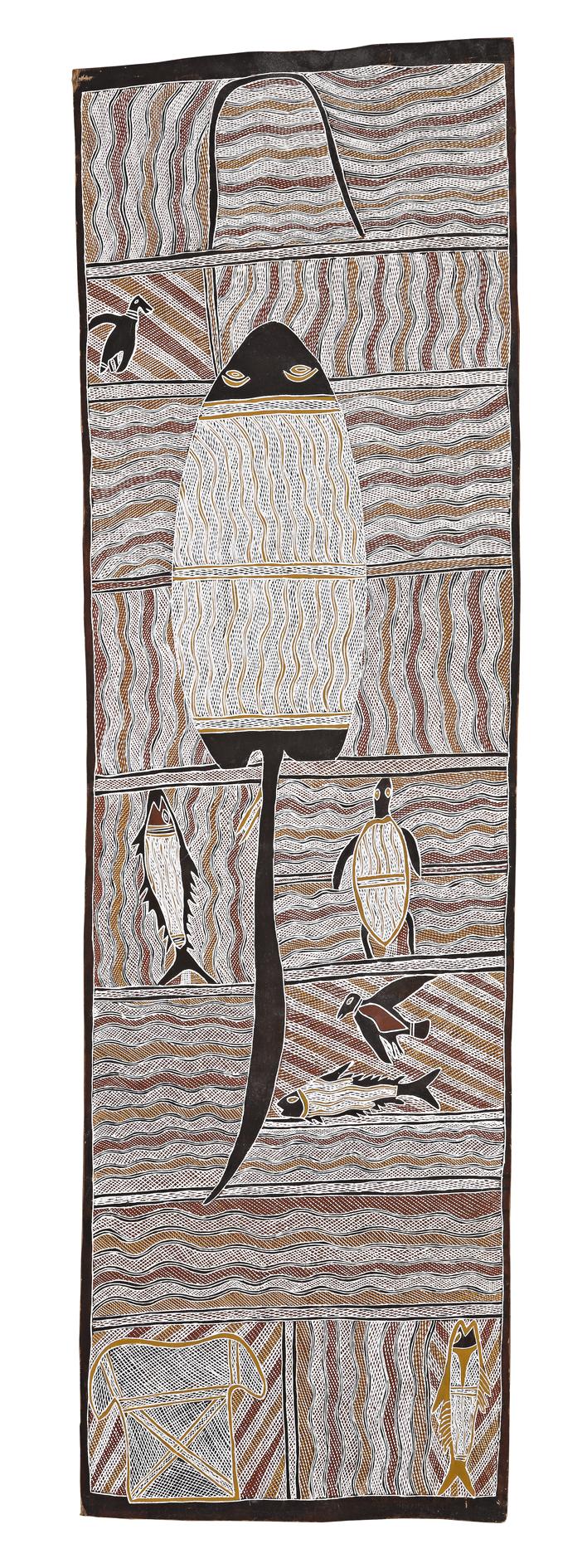 This work is accompanied by a certificate of authenticity from Buku-Larrngay Mulka Arts which states in part: 'The depicted Gurrtjpi is the stingray hunted much on the shallow shores of Blue Mud Bay. It is also a totem for the Madarrpa at Baniyala as they talk of Gurrtjpi having a path of creation at Baniyala ... During the days of Wonggu the Djapu warrior (and Menga's paternal grandfather), an area in the shape of the stingray was cleared by him and others who came to country to hunt Gurrtjpi mid way through the dry season. The area is still clear today, his two eyes holes in the ground where the current inhabitants pick sand to throw in the direction of the rock at Lulumu for good luck and plentiful fishing. The stingray Gurrtjpi has been depicted in these waters. The rock at its head. At its tail Wangupini the Wet Season Thunderhead, feminine with life giving rain bearing the possum string girdle of ancestral woman Nyapilingu. It exemplifies the life cycle of the spirit changing from physical to ephemeral and so on as the rain falls in the hinterland "sings" its various identities through the creeks until meeting a saltwater tidal surge mingling to the horizontal ocean and vapourising to return again borne by the mother cloud. Getkit the Yirritja tern reels in these ocean breezes. Makani the Queenfish whose shore hugging ancestral activities shaped some of this coastline is also shown along with Garun the loggerhead turtle perhaps an analogue of the rock itself.'