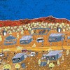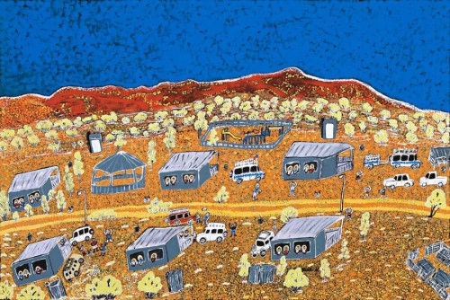 Karrku Adventure Camp is a radiantly joyous evocation of an outreach facility organized by the Western Australian Police and the Ngaanyatjarra Council and supported by Ngaanyatjarra School, Ngaanyatjarra Shire Youth Officers, Ngaanyatjarra Sexual Health, DCP and NPY Women's Council. But the painting's naive-realist style together with its irresistible comic touches mask the painting's deeper concerns: the camp's aim is to care for troubled teenagers and encourage them to go to school. The burlesque jollity of the tiny figures peering in wonder from their dorm windows therefore reflexively alludes to the spectre of cross-cultural disruption, identity trauma, and inter-generational dislocation and pain. Karrku Adventure Camp must therefore be read as much more than a delightful picture postcard: it is testament to the nurturing intimacy of a mother's vision, and more generally, women's culture as palliative restorative agency.