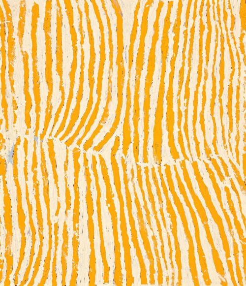 This painting is accompanied by a certificate of authenticity from Papunya Tula Artists which states: 'This painting depicts designs associated with the site of Lupulnga, a rockhole situated south of Kintore Community. The Peewee (small bird) Dreaming is associated with this site, as well as the Kungka Kutjarra or Two Travelling Women Dreaming. During mythological times a group of ancestral women visited this site holding ceremonies associated with the area, before continuing their travels north to Kaakuratintja (Lake Macdonald) and later the Kintore area. The lines in the painting represent spun hair-string which is used in the making of Nyimparra (hair-belts), which are worn by both men and women during ceremonies.'