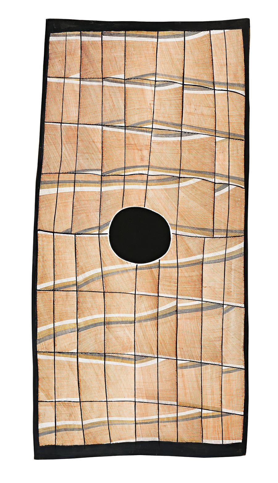 His first paintings on bark were representations of mythological figures, such as Ngalyod the Rainbow Serpent, totemic creatures and local natural species. These early paintings invoke ideas of spirituality, mythology and natural life cycles. It wasn't until after he had developed a more metaphysical representation of specific sites, events and landscape that Mawurndjul's fame grew. The artist eliminated representational imagery from his painting and instead embarked on a journey of exploration of rarrk (lineal clan designs), producing intricate paintings that are encoded with secret meaning. In Mardayin at Dilebang, 2009, the complexity and skill of Mawurndjul's ability as a painter of rarrk is evident. Surrounding the central circular motif, a rocky outcrop representing the head of Buluwana who was killed by the Giant Deaf Adder and turned to stone, are expanses of rarrk with multiple grids rendered in fine interlocking lines shifting in planes across the surface of the bark. The direction of the cross-hatching changes constantly and unpredictably.