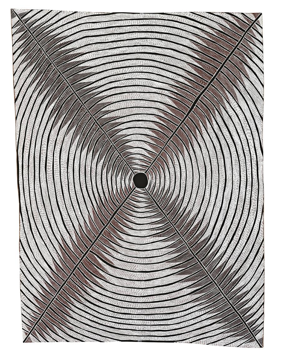 Of rare size and shape, this major bark by senior Yolngu woman Dhuwarrwarr Marika, daughter of renowned clan leader and artist Mawalan Marika, refers to the time before the first morning when the Djan'kawu (a man and his two sisters) left their residence of Buralku (an island of the ancestral dead) in a canoe to follow the morning star. As they travelled they sanctifed Dhuwa land,'singing the country and splitting it up into clan estates, designating sacred law (mayayin) song, dance, totem, language to each as they went.'1 The title of the work refers to the freshwater well with sacred and special qualities found on the sandy beach at Yalangbara. Rirratjingu song cycles celebrate how the two sisters, by plunging the sacred Malawan (digging stick) into the ground at this precise spot, gave birth 'from here' to all Dhuwa clans.
