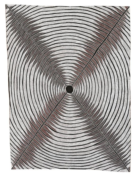 The central dot to which our gaze is drawn is surrounded by ever accumulating cross-hatching of the ancestral rrark design and is the point where the sisters drove their digging stick into the sand. It also represents the fontanelle at the top of the child's skull; the point or portal through which the spirit migrates at the time of death, but also birth. The four major axial lines connecting the circle to the corners of the composition are embodiments of the Dhuwa clans.'This design, the artist informs us, "is age-old" and can be found as a segment in her brother Wandjuk Marika's contribution to the famous Yirrkala Church Panels (1962-63)'.2
