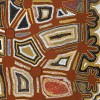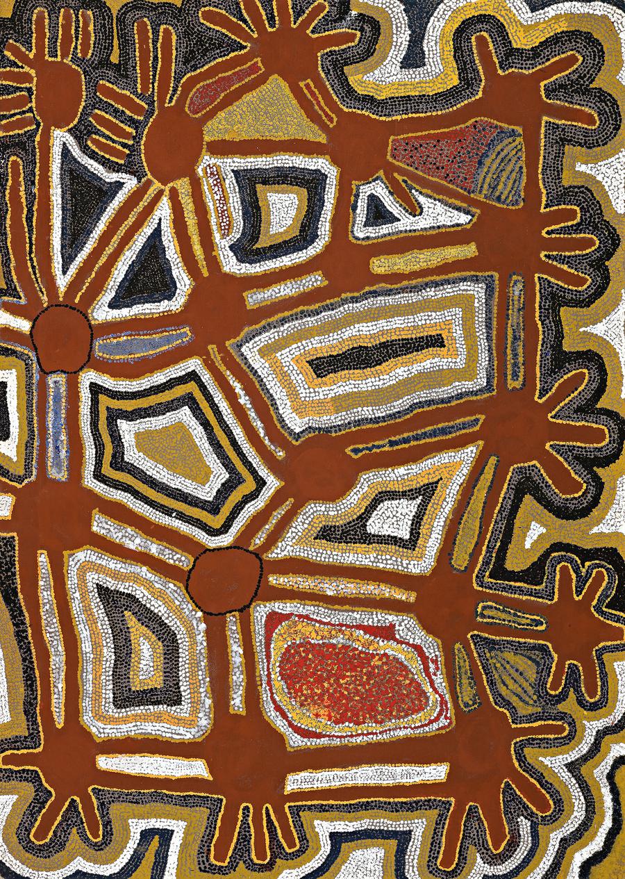 Wimmitji Tjapangarti understood his country intimately and was the custodian of numerous Tingari dreamings. The narrative which underpins Mingatjuru and Wartalarri would have originally been expressed in the sand. It is the story of Tingari creatures which left their marks in the sandy hills around Nyinmi, near Jupiter Well. Two small marsupials dug holes in the ground which can be seen in the daisy wheel roundels along the periphery of the painting. From these holes sprang Kurrkarpt or desert oaks, which produce an important flower that is sucked for its sweet nectar. The concentric lined shapes in the centre of this work also have their genesis in sand paintings depicting clouds, and the red circle in the lower right corner represents Nyintjitti Hill.2