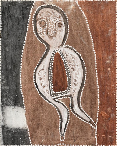 Known by a number of names, the Ancestral Owl is a central figure in Kimberley cosmology and is responsible for a number of ceremonial practices. The Owl has a connection to the Wanjina beings found predominantly in western and northern Kimberley, but not so much in the east, where the artist lived and painted. Thomas is therefore expressing a link between his original desert heritage and that of the east Kimberley, within the milieu of general Kimberley cosmology. Although the artist reveals some information to the uninitiated, the esoteric information that is held sacred to him and his people is concealed from the public and layered underneath the common visual narrative. There is a haunting complexity that is disguised by the minimalist composition. Thomas's connection to the land and as a custodian of important Dreamings reverberates throughout his oeuvre, as each work is an ode to the land, his people and their history both physical and spiritual.