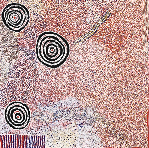 The small body of work produced over the space of a few intense years by senior Watiyawanu artist Bill Whiskey is becoming increasingly prized. With a pictorial focus so honed and precise as to be minimalist, yet with the unique auric vision of a shaman, he intended each painting as a ritual invocation of the power and beauty of the Pirupa Akla (Olgas) area - his birthplace in the early 1920s. Though he utilized the iconic language of dots and roundels that were staples of Western Desert art, he pushed into a new kind of open or virtual visual space in which the pictorial elements were allowed to float, miasmically hover and circulate. The effect was a unique pictorial 'buoyancy' - what Australian abstractionist Roger Kemp, in another but also intensely personal context, called 'liftoff'. Such a unique quality is highly pronounced in the current work. The three prominent roundels, denoting key landforms of the Olgas, seem uncontained by the canvas frame. Rather, in the manner of swarming birds, they migrate to gather at one side, thus suggesting that their potential for migratory motion is not, or rather, never finally accomplished. The effect of this 'unfastening' of placement or location at once proposes their presence not as literal landforms, but as mystic or numinously-charged bodies whilst suggesting that the landscape in which they dwell is an unfurling realm, one extending into infinity in every direction. The exact symmetry posed by the square canvas frame is thus rendered not as container, but as square lens opening to another realm: one seen from an extreme and untrammeled elevation. Here, in short, is a pictorial space radically different from the mathematically gridded Cartesian rigors of Western perspectivalism that has dominated, or perhaps haunted Western art since the time of Giotto and the demise of magical realism that required even angels to fold their wings and fall to earth.