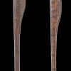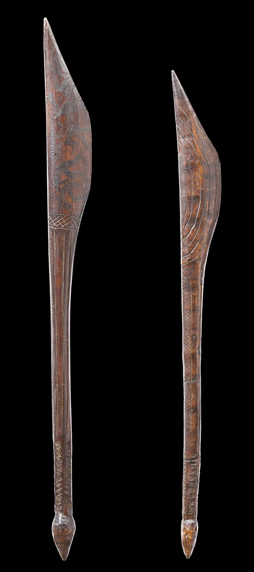 carved and incised hardwood, each with blade-like biconvex distal ends decorated with engraved designs on both sides, the shafts of circular section terminating in a bulbous pointed base. One blade is decorated with three figures, a lizard, an emu, and a swan, and on the other side a man throwing a spear, a kangaroo, and another figure. The second blade is decorated with engraved traditional motifs