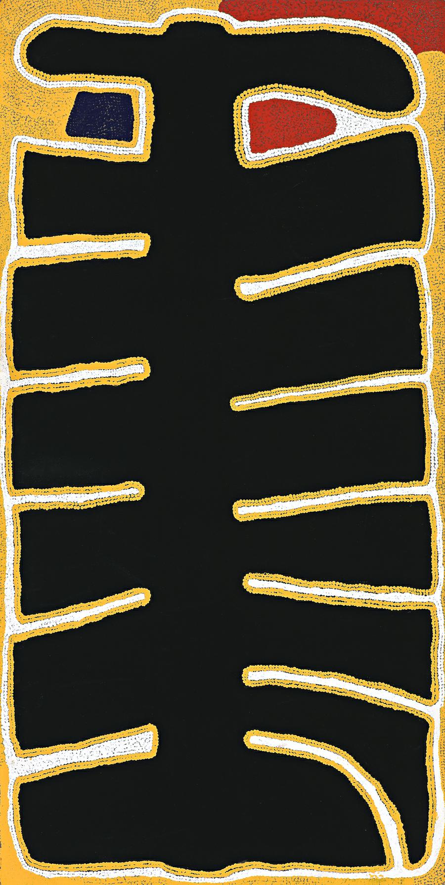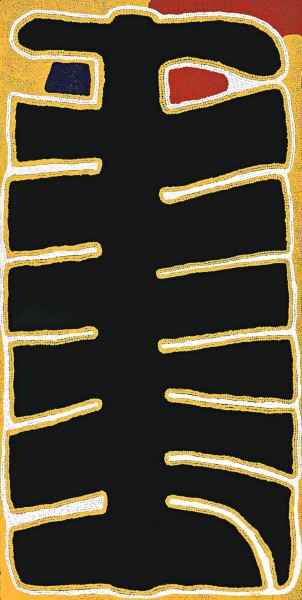 Travels of the Goanna Men in the Artist's Country, 1990 is an iconic painting within the artist's short career. The Wati Kutjarra Tjukurpa, or Two Goanna Men Story, is immensely significant for a number of Aboriginal clans and underpins the ritual education that turns boys into men. In their ancestral journeys, the Two Goanna Men travelled over a large expanse of desert country including that of the Warlpiri, Pintupi, Kukatja, Walmajarri and Ngardi peoples. On their travels, the two men moved in and out of the ground at various places, creating natural phenomena, drinking from rockholes and soakages and leaving traces of their presence in the landforms. The artist's outstation at Yagga Yagga, located 80 kilometres south of Balgo in the Great Sandy Desert, is the site of a major sequence of this story. Centred around Yagga Yagga, this episode of the story involves cultural activities such as teaching about the use of fire and the preparation and cooking of various foods. Sunfly's work is classic in its minimalist perfection, balancing large icons with fine detail to create monumental effects within moderately sized canvases. It is measured, and restrained, and imparts an unfailing atmosphere of authority.