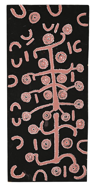 In his publication Papunya Tula: Art of the Western Desert, Geoffrey Bardon recounts how 'the vital dancing shapes of the yam plant was first painted on a linoleum floor tile by Charlie Wartuma at Papunya in 1971 using red paint tinter'.1 Bardon found the quality of this work poor so he asked Wartuma to paint another version with better quality materials. Executed in late 1971, Wild Potato Story is the result.