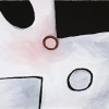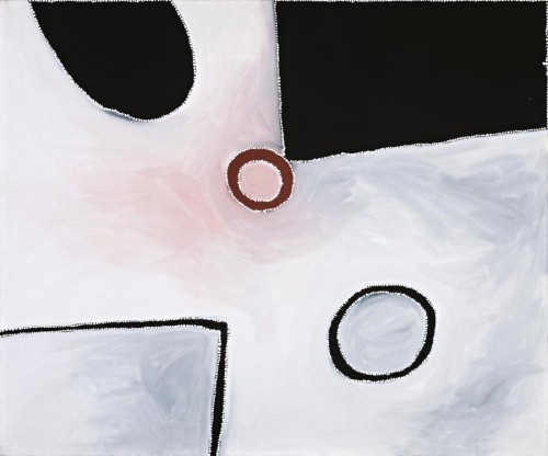Winperrji - Police Rock Hole characterises Bedford's move away from the more familiar style of the earlier east Kimberley painters to create his own representations of country. His use of colour has evolved with the elimination of an ochre palette and the introduction of a contrasting black and white ground often softened by washes of pink and blue-grey. The power of the form becomes dominant, highlighting the interplay between the positive and negative space.