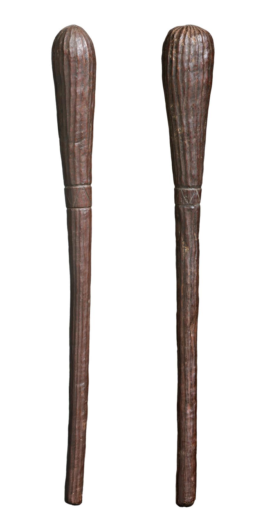 carved hardwood with finely incised striations, each with a horizontal incised collar containing zigzag designs