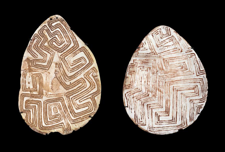 incised pearl shells with natural earth pigments