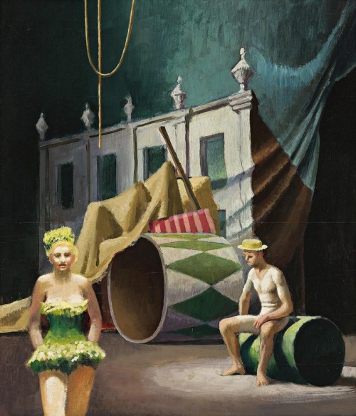 At the time of the 1957 exhibition at Macquarie Galleries, Sydney, the artist and critic James Gleeson noted that Smart's work lay within the romantic tradition, conveying 'an inner drama, so intense that the external world becomes as unreal as paste-board props in an empty theatre. The performers are walking in their sleep while a building wrinkles into folds and turns into a curtain.'4 Smart clearly understood the surreality that may be witnessed in life, but was always cautious to remember that '(t)he subject matter is only the hinge that opens the door, the hook on which one hangs the coat. My only concern is putting the right shapes in the right colours in the right places. My main concern is always the geometry, the structure of the painting.'5 Backstage was exhibited alongside a suite of similarly themed canvases at Macquarie Galleries bearing such titles as Sideshow, Acrobats resting, Clown in the ruins, Master of the acrobats, and The jostlers, with the last work now in the collection of the Art Gallery of South Australia.